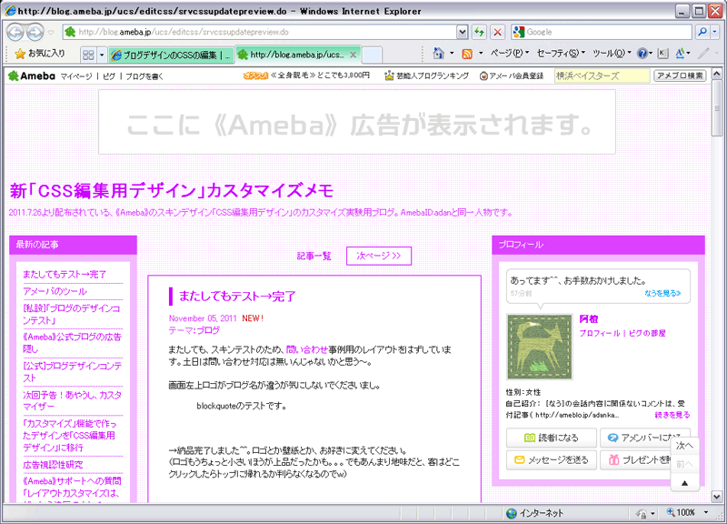 *マイページ→ブログを書く→デザインの変更→カスタム可能→
